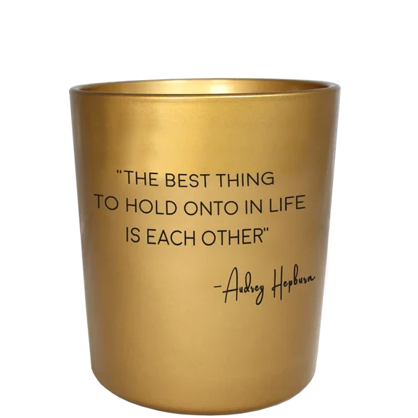 Deze geurkaars is gemaakt van biologische sojawas en heeft de geur Silky Tonka. Deze sojakaars wordt gesierd met de tekst 'The best thing to hold onto is each other'. Een quote van actrice en stijlicoon met Vlaamse roots; Audrey Hepburn.