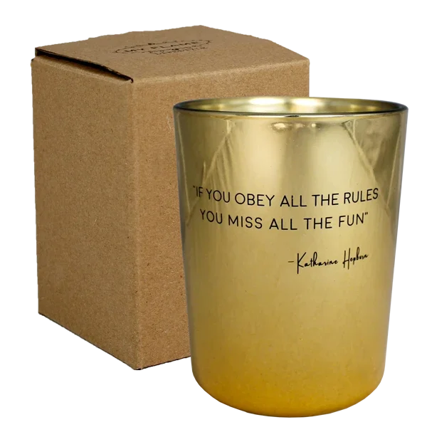 Deze geurkaars is gemaakt van biologische sojawas en heeft de geur Silky Tonka. Deze sojakaars heeft de quote 'If you obey all the rules, you miss all the fun'. Een quote van meervoudig Academy Award winnares Katherine Hepburn.
