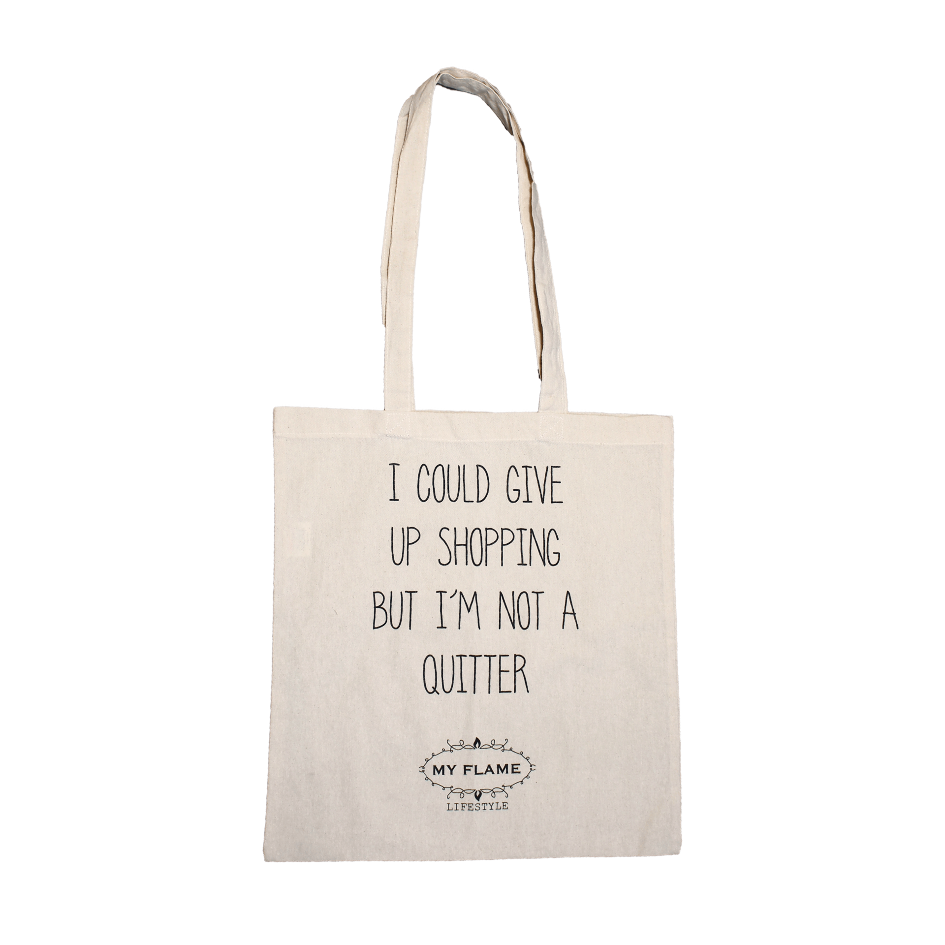 Een super leuk canvas tas met hengsels. Gebruik deze milieuvriendelijke tas voor de boodschappen, als sporttas, schooltas, en andere talloze momenten. Een heerlijke tas met een nog heerlijkere quote 'I could give up shopping but I'm not a quitter'. Enjoy!